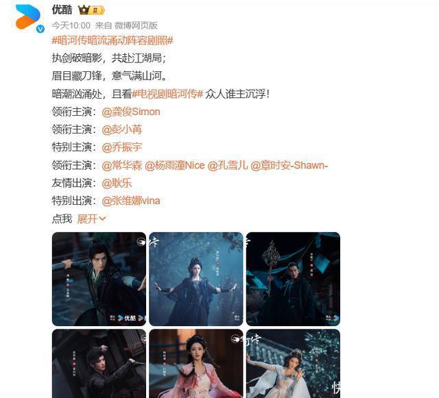 一般来说,只有一部作品播的不错,才会有同设定背景下的系列作品接上。从《少年歌行》到《少年白马醉春风》,也让不少观众重新感受到了武侠作品的魅力。       很多人都知道龚俊主演的《暗河传》也是武侠题材的作品,却不知道这部剧也算是“少年系列”。       不过这一点也不影响网友期待《暗河传》,在武侠作品式微的情况下,站内预约人数依旧超过了二百万,足以见得这部作品的热度。       从剧方放出的预告片和“暗流涌动”主题剧照看,这部作品很快就能和大家见面,估计已经进入了排播阶段。       剧方既然能在社交平台上放出全阵容的新剧照,那就说明有空降播出的可能性。毕竟赵露思主演的《许我耀眼》也是无宣发空降上线,已经成为了年度热剧之一。       不得不说,《暗河传》这次更新的角色剧照真的很有波谲云诡的氛围。龚俊饰演的苏暮雨穿着黑色劲装,眼神凌厉,很有武侠男主的范。       高马尾和黑色劲装的搭配更显英气,这套衣服真的很适合龚俊,不愧是武力值超高的暗河第一杀手苏暮雨。       虽说《暗河传》是大男主视角叙事,但群像角色的塑造也很精彩。彭小苒饰演的慕雨墨是暗河第一美人,异域风的深紫色衣服穿在她身上又美又飒,像极了暗夜中绽放的玫瑰。       从之前的角色路透就能看出,彭小苒在《暗河传》里绝对颜值担当。哪怕受伤战损,也依旧让人挪不开眼。       和之前经典的红衣古装不同,紫衣穿在她身上散发着迷人又危险的氛围,让人很难不心动。       杨雨潼在《暗河传》中饰演女主白鹤淮一角,说是女主也只是因为她是原著里苏暮雨的官配,但戏份并不多。       小姐姐的红衣剧照看起来状态不错,精致的五官和大气的发型都很有辨识度。她的眼神看起来很坚定,很有古早女主正气凛然的气场。       孔雪儿在《暗河传》中虽然只是演了个配角,但剧照也一点不敷衍。穿着一身白衣看起来仙气十足,楚楚可怜的神情让人生出几分怜爱之心。       她虽然是爱豆转演员,但妆造运一直不差,从《折腰》到《暗河传》都是有效客串。       常华森算是各大S级大制作里的热门配角,从白鹿的《白月梵星》到李一桐的《天地剑心》再到《暗河传》的男二,他的资源也好起来了。       最近还和李一桐二搭了《美人余》,他也算是宜古宜今的演员了。在《暗河传》里很有热血男二的气场,对观众的眼睛也很友好。       乔振宇在《暗河传》里的配角造型看起来老谋深算,很有反派的味道。不知道这次是真的演反派,还是和《藏海传》的永容王爷一样虚晃一枪?       不过乔振宇能客串出演也算惊喜,哪怕人到中年,他依旧是美大叔一个,人气也不低。       李寒衣这个角色在《少年歌行》里赚足了观众的眼泪,她和赵玉真的感情线成为了很多人的意难平。       张维娜在《暗河传》里再次出演李寒衣一角也算是梦幻联动,还是很期待姐姐的精彩表现!       龚俊《暗河传》新剧照好绝!少年侠客太迷人,彭小苒惊艳女主正气!你期待这部作品吗?欢迎在评论区留言讨论。